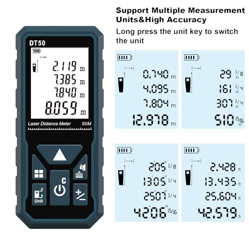 DT50 Classic Laser Measuring device is portabe and super easy to use; It is designed with versatile functions and especially for needs of high-precision distance measurements by using Laser Precision Technology.